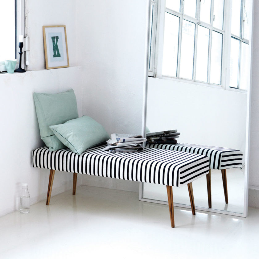 Die gestreifte Bank ist schon alleine ein Hingucker. Mit ein paar Kissen und einem großen Spiegel wird sie zur Leseecke (House Doctor).