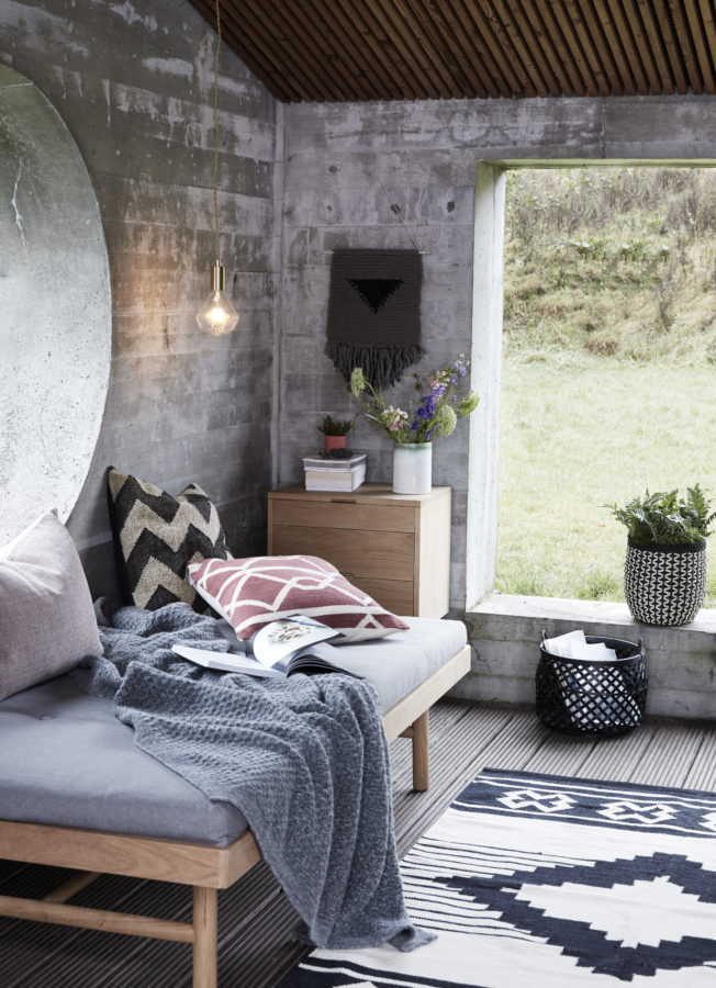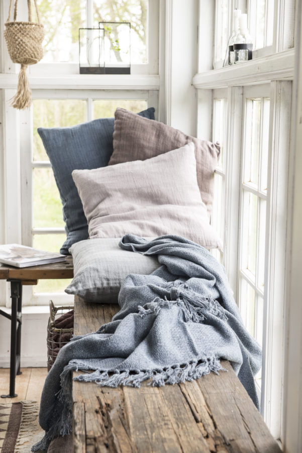 Eine Holzbank am Fenster kann hart und kalt sein – aber nicht, wenn sie mit weichen Kissen und Decken gepolstert ist und einen fantastischen Ausblick in die Natur bietet (IBLaursen).