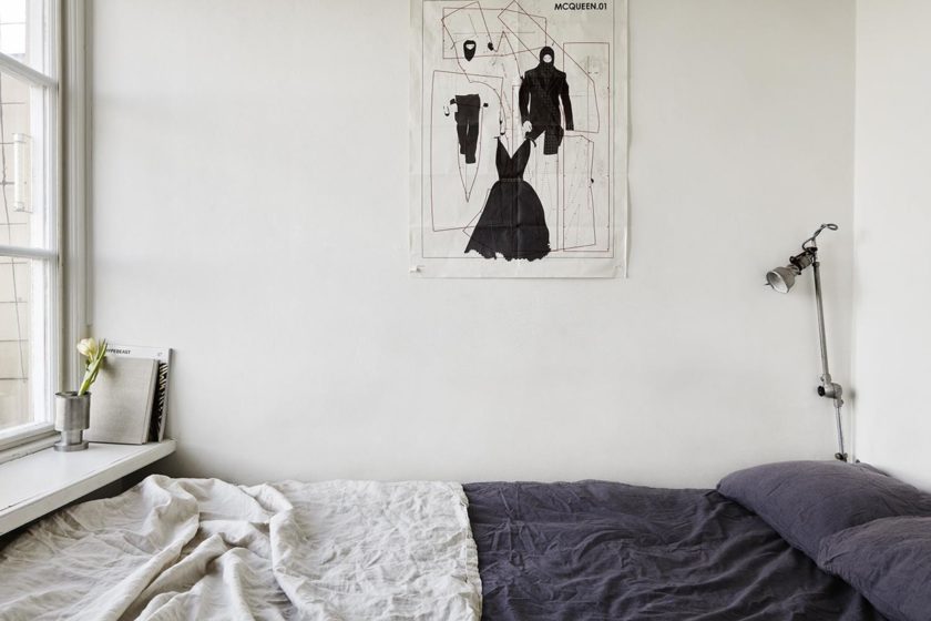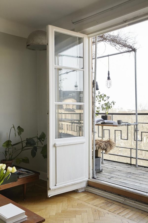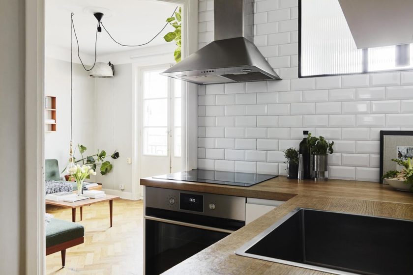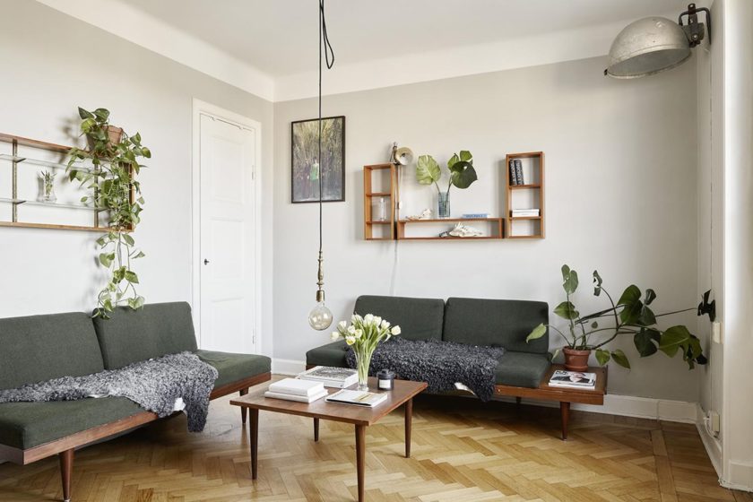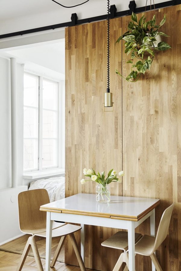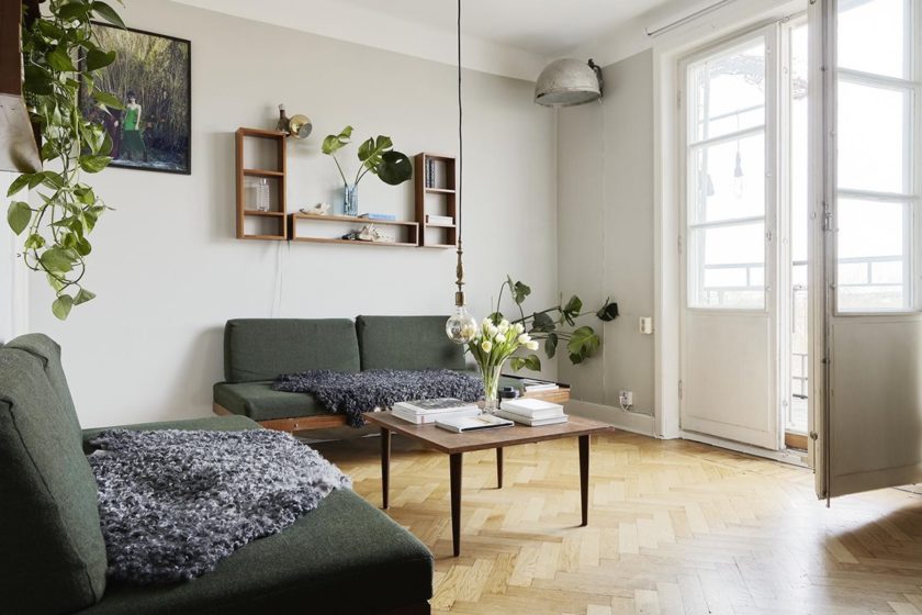 Beginnen wir mit dem Balkon, dem zweiten Wohnzimmer der Wohnung: Blick ins Grüne, Platz zum Sonnen, Arbeiten und Lesen, zum Frühstücken und Rumsitzen. Ein warmes Fellpolster wärmt beim Sitzen, der Tisch ist raffiniert mit alten Rohren befestigt. So mausert sich der Balkon zum vollwertigen Wohnraum.Schweden sitzen nicht nur im Sommer draußen: sobald die Sonne kommt, geht’s raus, mit dicken Decken und warmen Jacken, hauptsache ein wenig Sonnenlicht erhaschen. Auf diesem kleinen Balkon findet sich dafür ein besonders gemütliches Plätzchen.Alte Türen und Fenster sind vielleicht nicht immer so perfekt isoliert und haben den einen oder anderen Kratzer, aber genau das macht ihren Charme aus. Dazu das alte Fischrätparkett und schon befindet man sich mitten in einem wahrgewordenen Vintage-Traum.Grün, Weiß und Holztöne verzaubern dieses Wohnzimmer in ein feines farbliches Ensemble: Grüne Sofapolster, Pflanzen, ein Bild mit Naturmotiv (das übrigens ziemlich cool etwas höher hängt, als gewöhnlich), dazu hölzerner Boden, Tisch, Sofagestell und Regal in dunklen Holznuancen, während weiße Wände und Leuchten für Helligkeit sorgen.In vielen schwedischen Wohnungen und Häusern gibt es Einbauschränke. Das ist besonders geschickt, weil man nicht so viele Schränke mit umziehen muss und all der Krams, den man nicht ständig braucht, einfach darin verschwinden kann. So wirkt ein Zimmer gleich viel aufgeräumter.Ein kleiner Essplatz, dahinter die Küche, hier wird jeder Winkel der Wohnung perfekt genutzt. der Weiß lackierte Tisch wirkt filigran, die weiße Küche verspricht ein helles Kochvergnügen.Raffiniert: Was an der Wand hinter dem Esstisch wirkt, wie eine hölzerne Wandverkleidung, ist bei genauerem Hinsehen eine Schiebetüre, die das kleine Schlafzimmer (bei Bedarf) vom Rest der Wohnung trennt.Cooler Kontrast zu den Vintage-Möbeln im Wohnzimmer: Die moderne Küche mit weißen Fliesen und weißen Fronten. Wichtig in kleinen Küchen: eine Dunstabzugshaube.Pflegeleichte Fliesen und weiße Schranktüren ohne Griffe wirken modern und clean, die natürliche, hölzerne Arbeitsplatte sorgt dafür, dass die Küche nicht klinisch wirkt.Wer zur Tür reinkommt bekommt gleich das Farbthema der Wohnung serviert: Braun, Weiß und Grün. Bitteschön, herein spaziert!Das Schlafzimmer ist gerade mal so groß, dass ein Bett hinein passt. Aber mal ehrlich: sooo viel mehr Platz braucht man dort auch eigentlich nicht, oder?