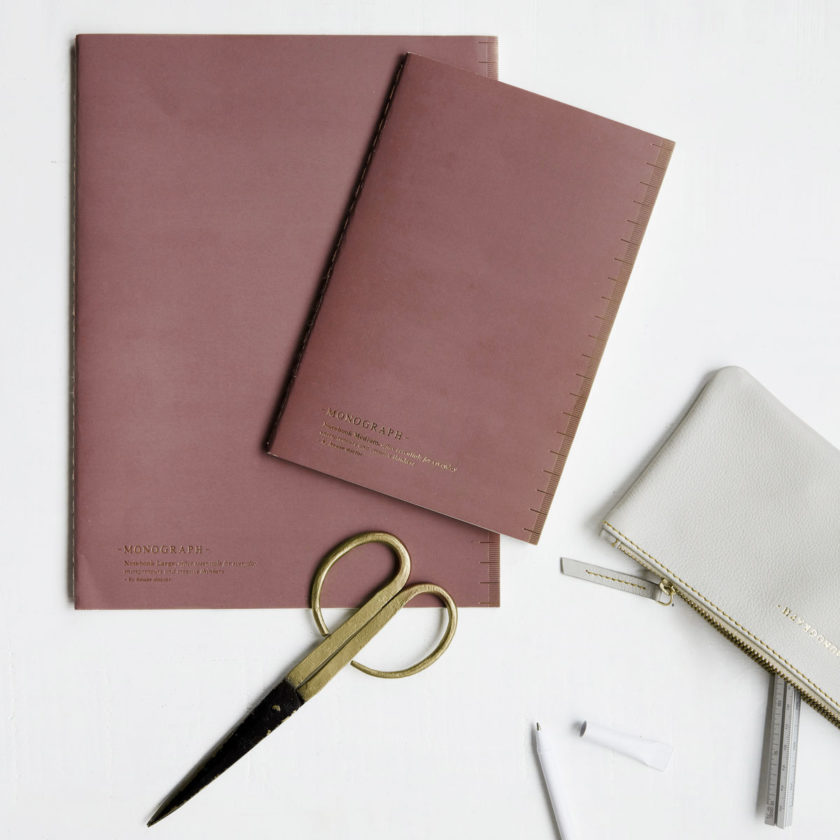 Goldfarbene Schere trifft auf bordeauxrote Notizheftchen, neben Stiftetäschchen – Monograph aus Dänemark beweist hier rotgold auf weiß, wie es schön funktioniert.