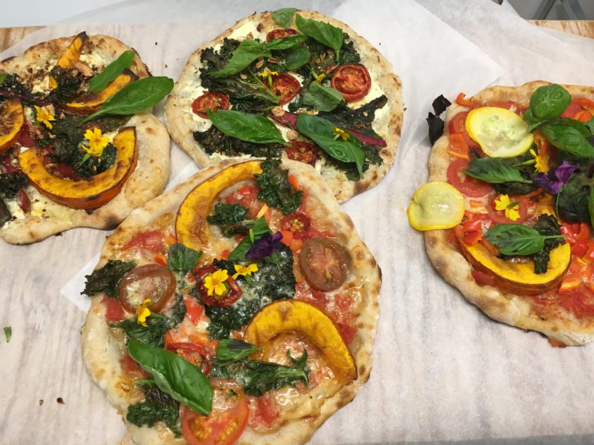 Am Abend sollen wir unsere eigenen Pizzas in seinem Restaurant backen. Also packen wir in die Papiertüten, was reinpasst: Tomaten, Fenchel, Zucchini, Paprika und Mangold, später noch Kürbis, Zwiebeln, Rucola und Äpfel aus dem Garten. Alles bio, alles frisch. Und das schmecken wir, als wir am Abend vor unseren knusprigen Pizza-Tellern sitzen.