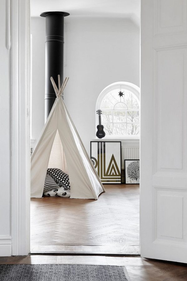 Von außen schon eindrucksvoll, vor allem, wenn es so herrlich blüht im Garten – aber wartet mal ab, bis ihr dieses Schmuckstück von innen seht!Välkommen!Der Küche sieht man förmlich an, dass das Meer nicht weit ist. So sommerlich frisch und leicht kommt sie daher. So, als ob man sich hier mit meernassen Haaren, nach einem langen Strandtag, einfach ans Kochen machen kann.Ein großes Haus braucht einen großen Tisch und große Hängeleuchten sind auch nie verkehrt! Der Clou: Die Farbe der halbhohen Wandverkleidung findet sich in den Leuchten wieder.Die Wandverkleidung ist in vielen schwedischen Häusern zu finden. Meistens ist sie weiß, aber farbig gibt sie dem Raum noch einmal einen ganz eigenen Charakter. Besonders hübsch: der schmale Rand der Verkleidung wird zur Galerie.Der typisch skandinavische Einrichtungsstil ist als minimalistisch und clean bekannt. Tatsächlich jedoch finden sich in den meisten schwedischen Wohnhäusern auch alte Möbelstücke, sogenannte „Loppisfynd“, also Fundstücke vom Flohmarkt, oder aber Erbstücke aus Familienbesitz. Den Besuch eines Loppis sollten sich übrigens alle Schwedenreisende einmal gönnen. Man findet wunderbare Teile für wenig Geld! Einfach nach den „Loppis“-Schildern an den Straßen Ausschau halten.Schlafzimmer mit Balkon und wundervollem Blick ins Grüne.In einem solch großen Haus gibt es natürlich nicht nur ein Schlafzimmer. Dieses hier ziert eine Bilderwand, die farblich perfekt auf das Graublaue Bettarrangement abgestimmt ist.Alter Parkettboden im ganzen Haus erhält den Charm vergangener Zeiten, ebenso wie liebevoll restaurierte Türen und Türrahmen.Der sogenannte „Uterum“, der typische Draußenraum, ist in diesem Haus nicht verglast, wie oft üblich, sondern erinnert ein wenig an Italien, mit seinen Torbögen.