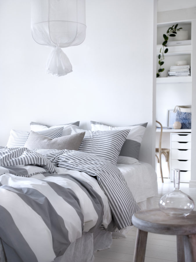 Streifzug durch die Nächte: schmale und dicke Streifen in Weiß und Grau auf Kissen und Decken (Ellos).