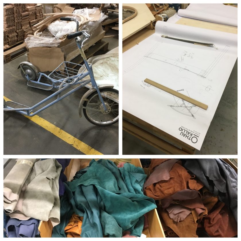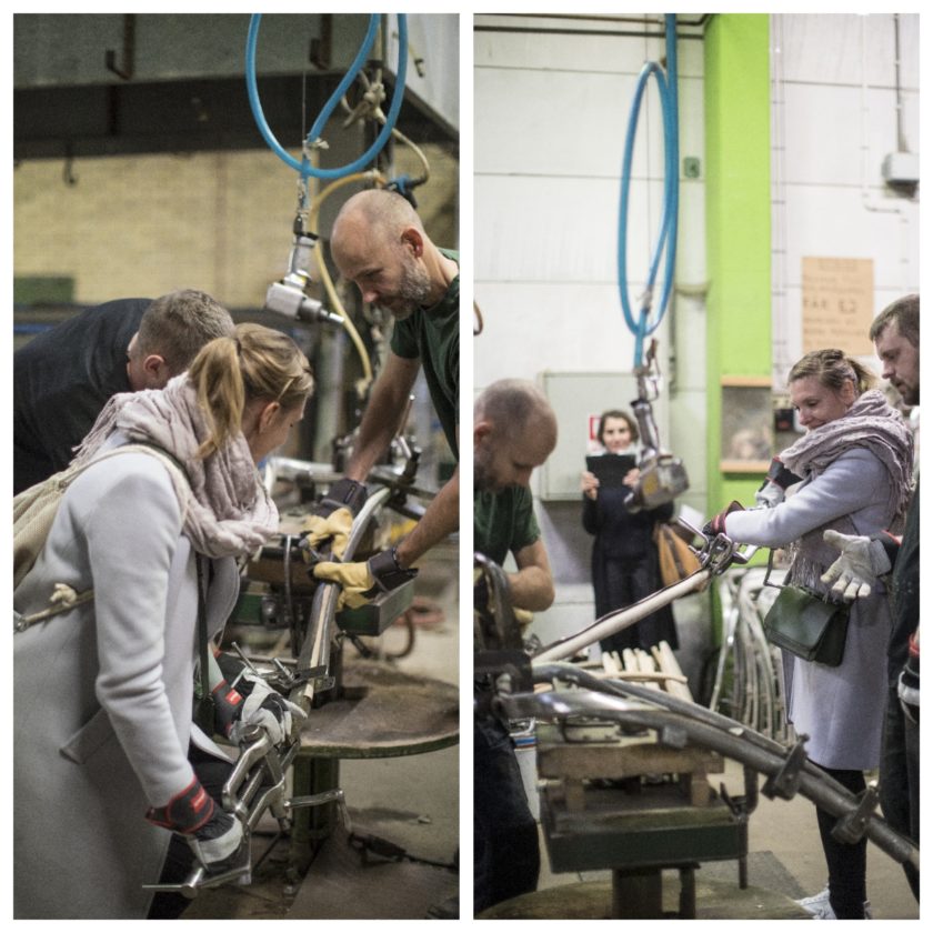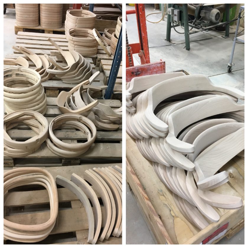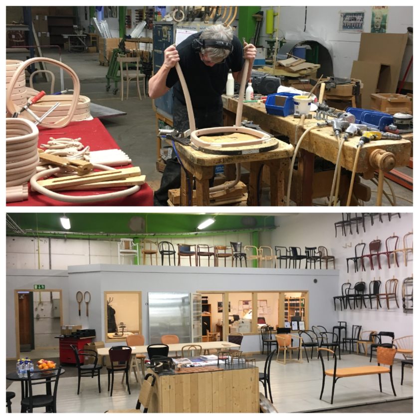 Dieses aufwändige Verfahren beherrschen nicht viele Menschen, erfahren wir, während wir durch die Hallen der Gemla-Fabrik geführt werden. Auf den Regalen rechts und links lagern unzählige Stuhlgerippe, halbfertige Hocker, stapelweise Rückenlehnen, Stuhlteile in Rohform. Vor allem Birke und Esche werden hier zu Stühlen verarbeitet, ein Großteil des Holzes kommt mittlerweile aus Polen. Um aus den Stämmen Stühle zu formen, gibt es bei Gemla spezielle Metallgestelle, die teilweise über einhundert Jahre alt sind. Eine besondere Behandlung mit Feuchtigkeit und Wärme macht das Holz zunächst geschmeidig, anschließend wird es in die Metallgestelle gespannt und per Hand gebogen.