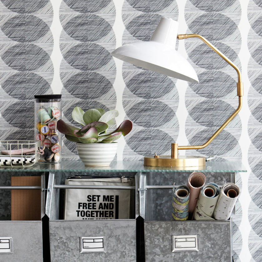 Ist ein bisschen größerer Aufwand, aber der Effekt ist ebenso größer: Tapete (Mimou) passend zur Leuchte und Einrichtung auswählen.Statt einem Regal gibt es hier ein paar gestapelte Kisten zum Verstauen (Hubsch).