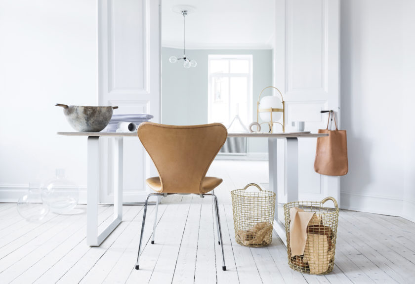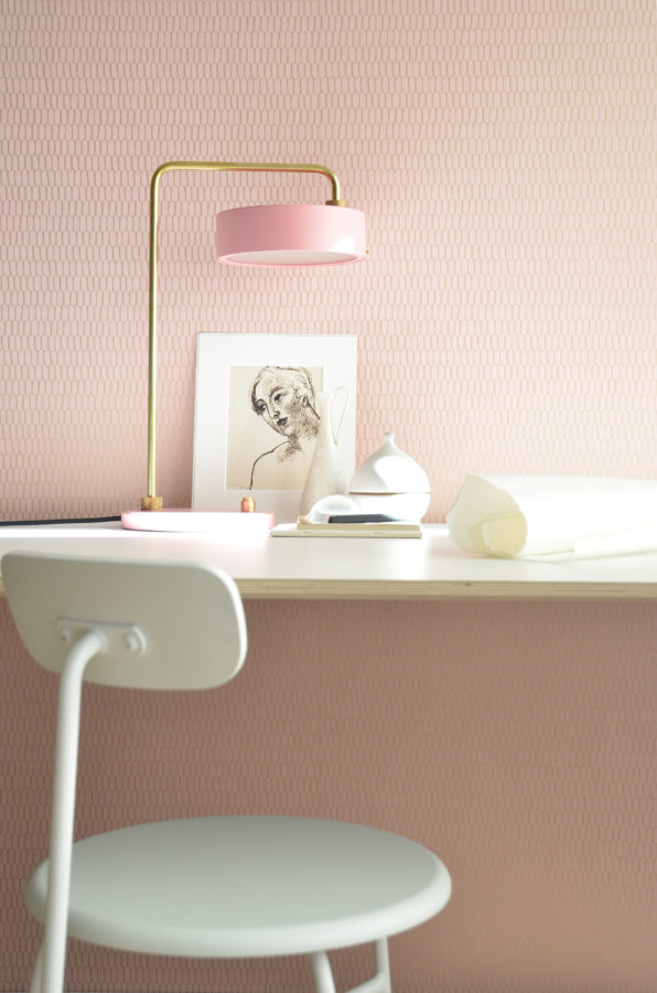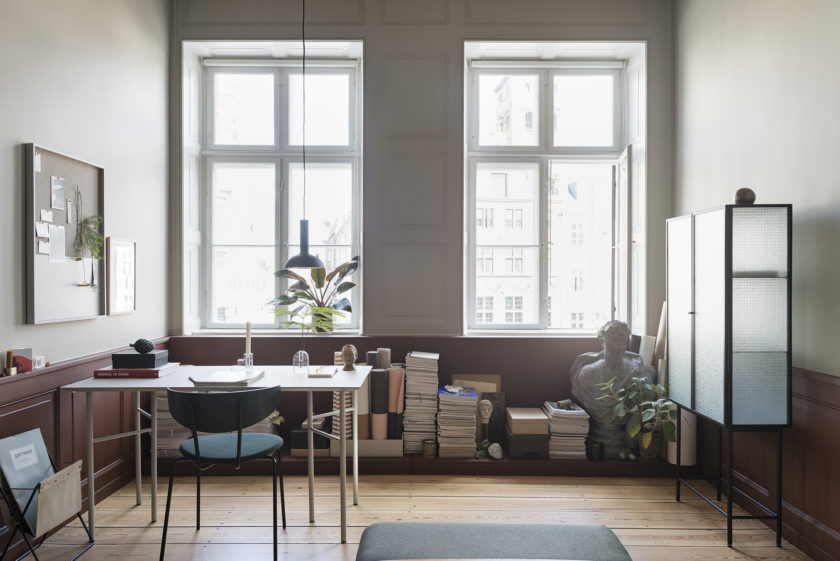 Den Schreibtisch nicht ganz an Wand oder Fenster stellen – so bleibt dahinter Platz für Unterlagen, Zeitschriften, Bücher… (Ferm Living)